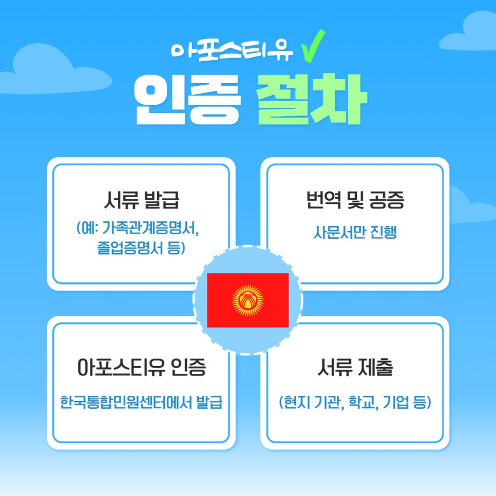 쉽게 말해, 한국에서 발급된 서류를 키르기스스탄에서도 공식적으로 인정받을 수 있도록 해주는데요