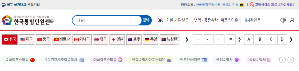 정부 국가대표 선정기업인 한국통합민원센터에서는 중국과 대만 관련 모든 업무를 담당하는