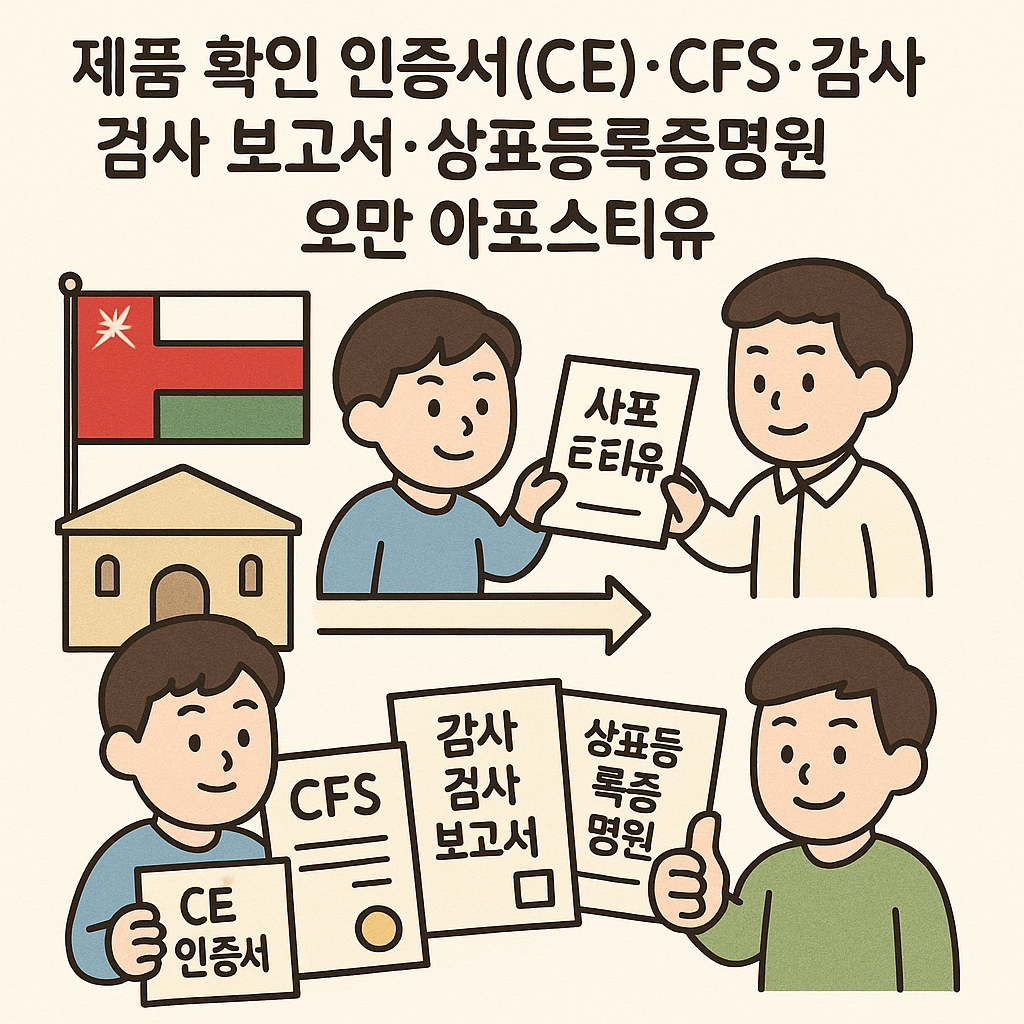 제품 확인 인증서(CE)·CFS·감사 검사 보고서·상표등록증명원 오만 아포스티유 인증